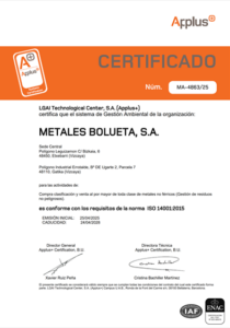 La obtención simultánea de ambos sellos sitúa a Metales Bolueta en la vanguardia del sector, ofreciéndole a usted la tranquilidad de trabajar con un socio que se rige por las mejores prácticas internacionales, optimiza sus procesos y contribuye activamente a un futuro más limpio y eficiente. Porque para nosotros la calidad no es una meta: es nuestro punto de partida.